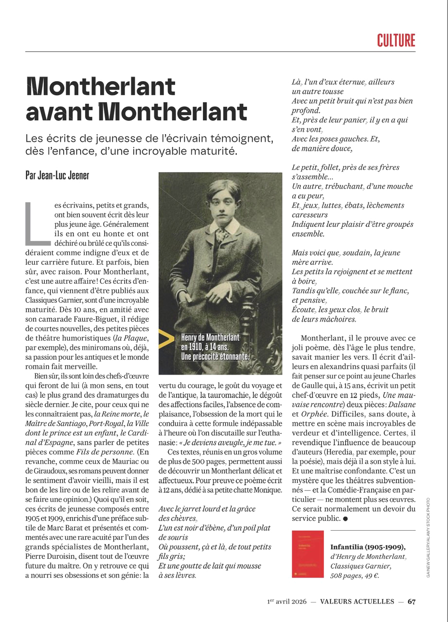 Articles sur Montherlant (hors presse)189. Luc Jeener, Montherlant avant MontherlantNoteCet article, écrit par Luc Jeener, un des plus grands spécialistes de l’œuvre de Montherlant, a été publié dans Valeurs Actuelles le 1 avril 2026