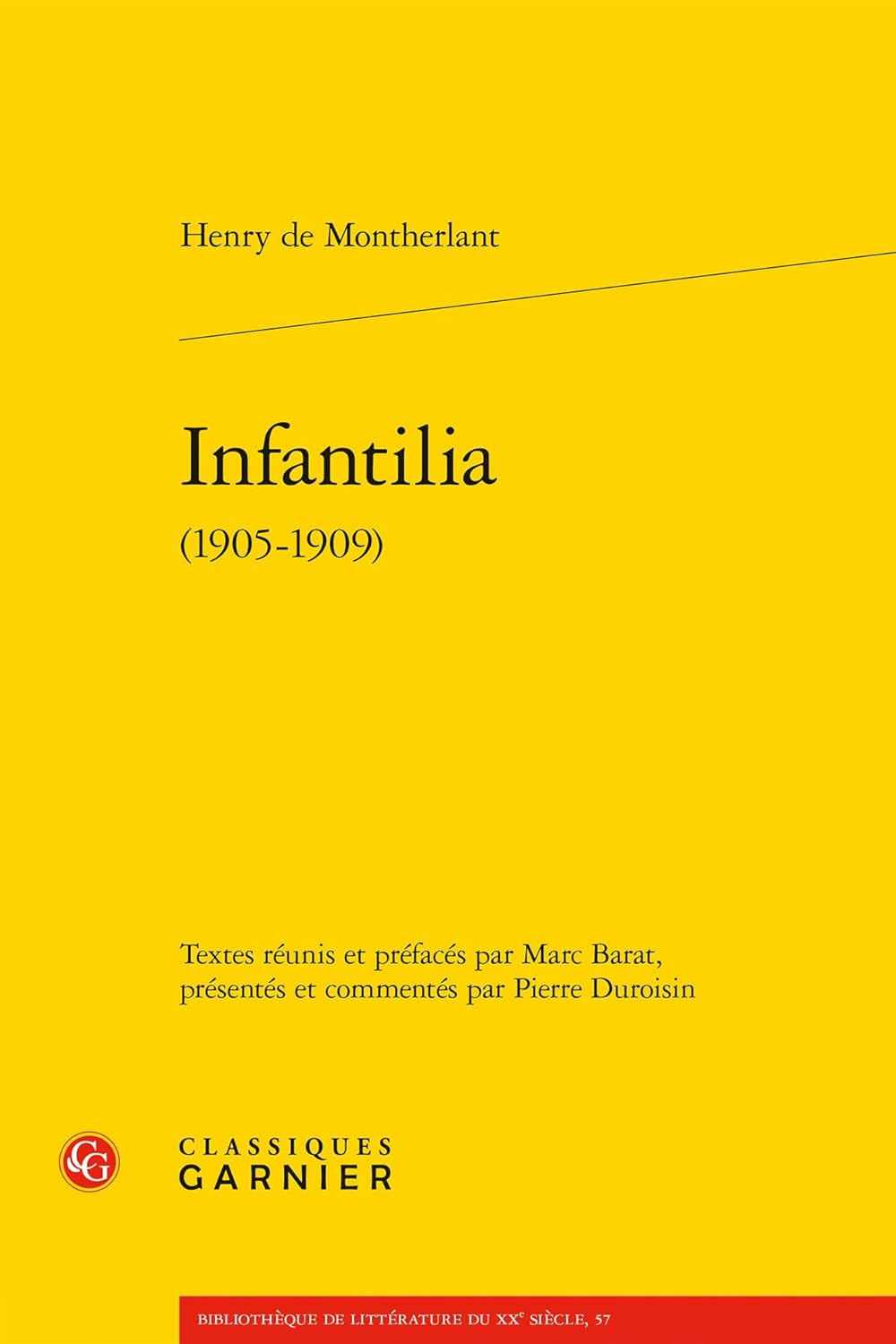 - Henry de Montherlant, Infantilia 1905-1909 (éd. Pierre Duroisin), Paris, Classiques Garnier, coll « Bibliothèque de littérature du XXè siècle », n°57, 2026, 507 pages, prix 49 eur, date de publication 04 mars 2026. Ecrivain-né, Henry de Montherlant a composé, entre 1905 et 1909, quantité de récits, de contes, de saynettes, parfois inspirés de l’antiquité romaine qu’il a d’aventure qualifiés d’infantilia. Il a aussi composé, dans le même temps, un grand nombre d’œuvres en vers, d’aucunes fort ambitieuses.