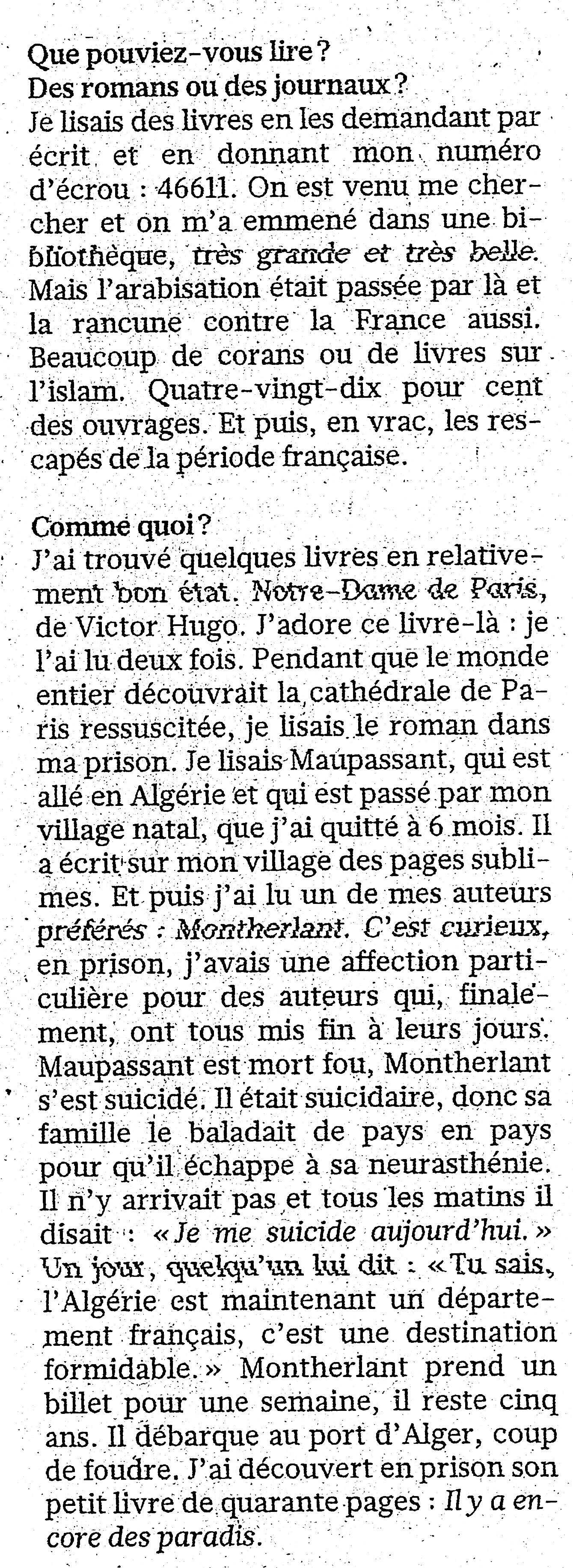 Articles sur Montherlant (hors presse)185. Boualem Sansal, écrivain algérien, et Henry de MontherlantDans un entretien fleuve au Figaro, du 24 novembre 2025, l’écrivain emprisonné pendant un an en Algérie raconte son arrestation et le quotidien de sa vie d’otage, entre pressions politiques, expérience humaine et échappées littéraires. J’extrais de ce long texte terrible, la question du Figaro : Et vous aviez de quoi lire ? Voici ci-joint la réponse de l’écrivain franco-algérien, titulaire de nombreux prix littéraires, et dont l’œuvre est éditée chez Gallimard. L’écrivain algérien a trouvé de l’aide en relisant Montherlant, mais exagère beaucoup en décrivant Montherlant comme un neurasthénique suicidaire. Henri de Meeûs Extrait du Figaro du 24 novembre 2025Cliquer sur l’images pour les agrandir